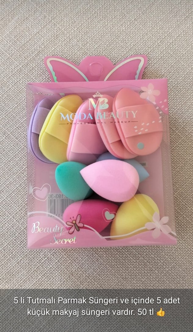 Parmak tutma özelliği olan, pastel renklerde 5 adet makyaj süngeri seti. MCDA Beauty markasına ait.