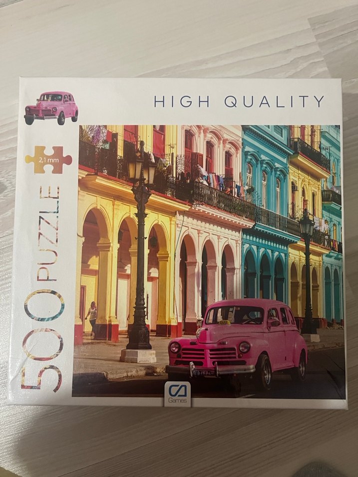 Pastel renklerde, yüksek kaliteli malzemeden yapılmış 500 parçalık şehir manzaralı puzzle, üzerinde pembe eski model araba bulunur.