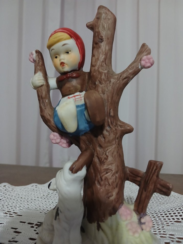 Pastel tonlarda, köpekten kaçarak ağaç üzerine çıkmış ama ayakkabının birini köpeğe kaptırmış :) yumuşak bej ve pembe detaylarla süslenmiş.Çizgi film kahramanı Maşa porselen biblo. made in Taiwan . yükseklik 17cm.