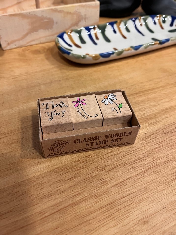 Pastel renklerde, klasik ahşap malzemeden yapılmış üçlü damga seti. 'Thank You' yazısı ve çiçek desenleri içerir.