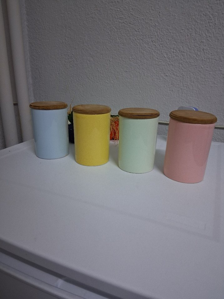 Pastel tonlarda, ahşap kapaklı, mutfak malzemeleri için uygun saklama kavanozlarıdır. kusurlarını belirttim