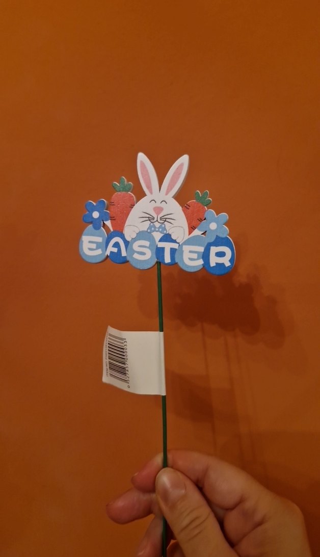 Pastel renklerde, tavşan, havuç ve çiçek figürlü, "EASTER" yazılı ahşap Paskalya süsü.