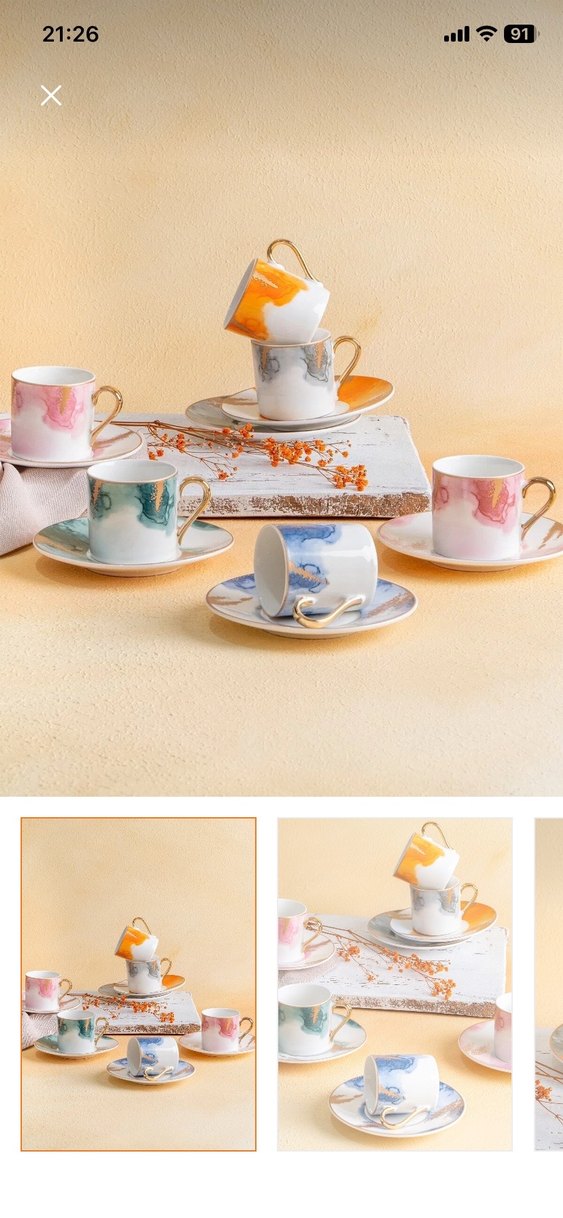 Pastel renklerde, altın kulplu kahve fincanları ve tabaklarından oluşan zarif bir set. ☕