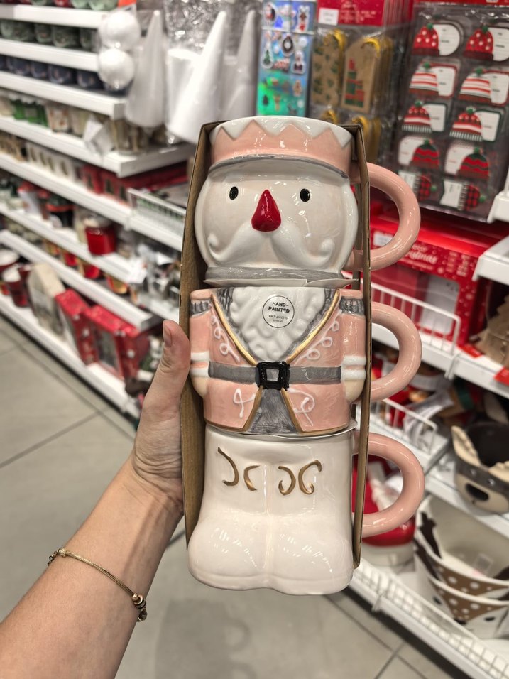 Pastel renklerde, beyaz ve pembe detaylı asker figürü şeklinde 3'lü seramik kupa seti. Her kupa kulplu ve dekoratif bir tasarım oluşturuyor. ☕