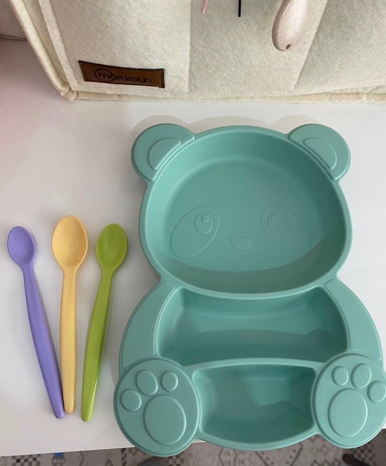 Pastel renklerde, ayıcık şeklinde bölmeli çocuk tabağı ve 3 kaşıktan oluşan set. Hiçbir sorunu yok. Tabak vakumlu değildir. Ürünler silikon değildir. Tabak E bebekten alındı. Kaşıklar da wee marka.