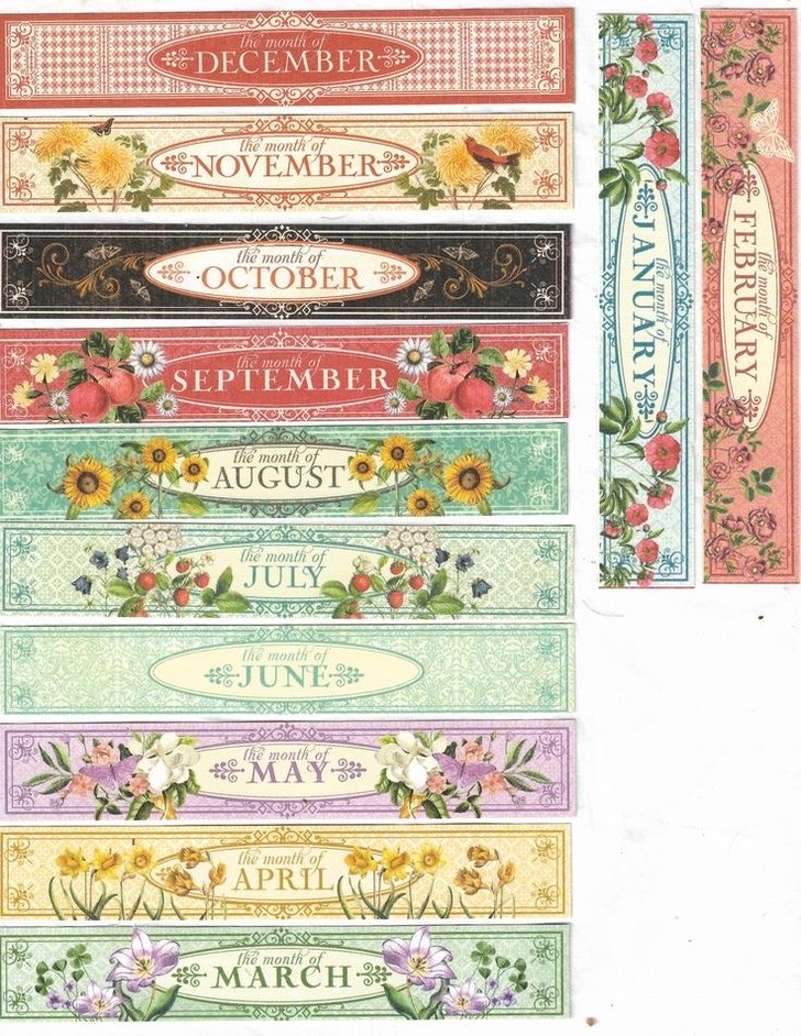 Her ay için pastel renklerde ve çiçek desenlerinde planlayıcı etiketleri. Ocak'tan Aralık'a kadar aylar mevcut.