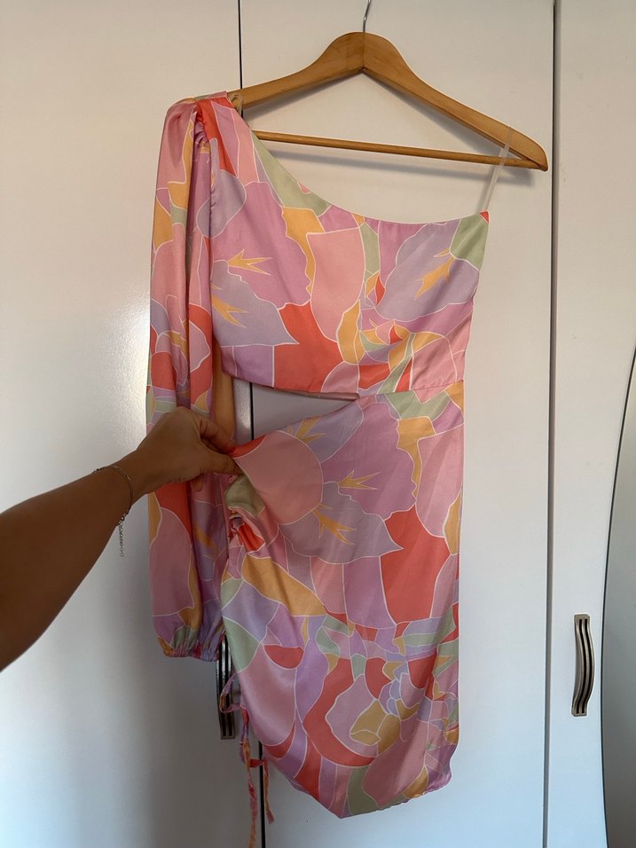 Bel kısmı dekolteli tek omuz elbise. Etek yanındaki drapeli kısım ayarlanabiliyor.
