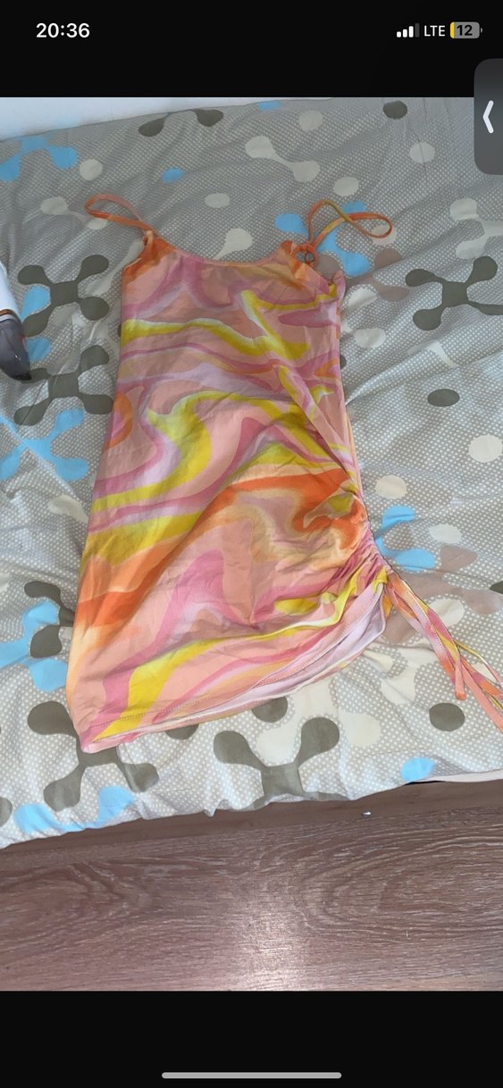 Bohem tarzda, bağcıklı askılı, uzun ve vücuda oturan pareo. Çok renkli pastel tie-dye deseniyle retro havası, parti için uygun. Elbise olarak giyiniyordum normalde uygun iç çamaşırıyla gayet güzel giyiliyor