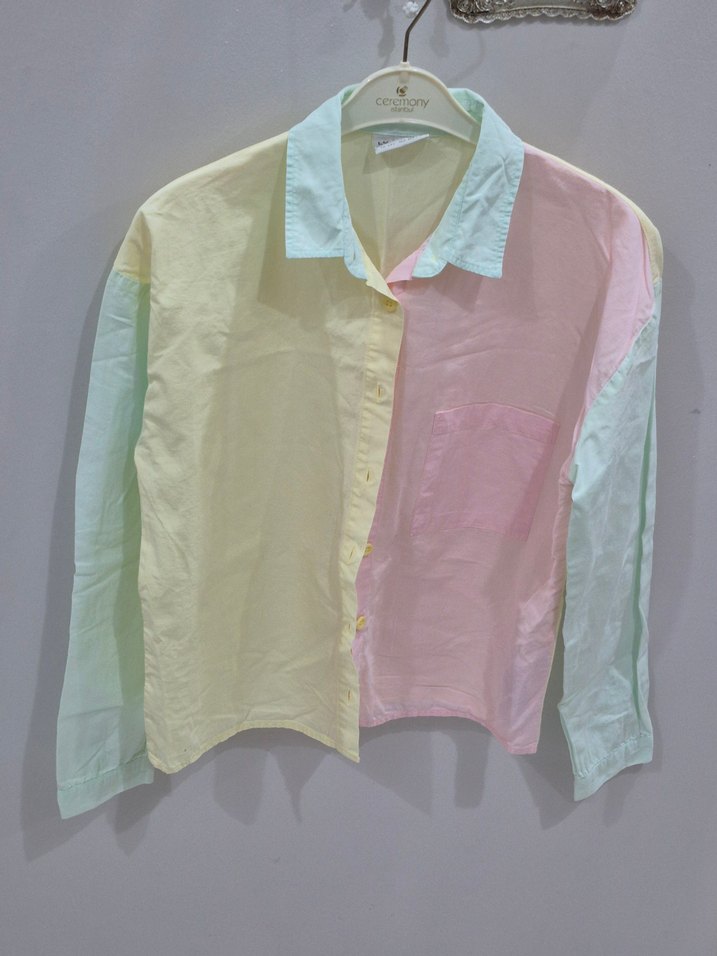Pastel tonlarda, uzun kollu, düğmeli ve yakalı pamuklu kadın gömleği. Bağlama desenli, bol kesim ve kısa boyda, günlük rahat stil için uygundur.