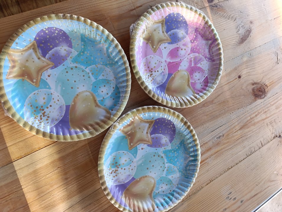 Pastel renklerde, balon ve yıldız desenli çok renkli parti tabakları, kutlamalar için uygun.