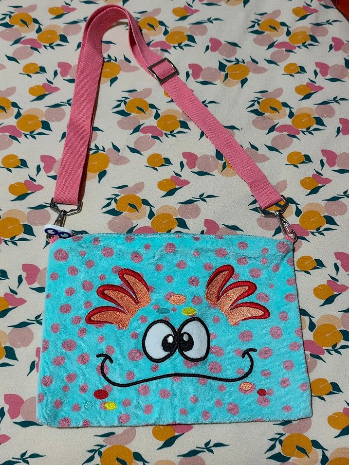 Pastel çok renkli, baskılı yüz desenli, ayarlanabilir pembe askılı, yumuşak dokulu bebek çantası.