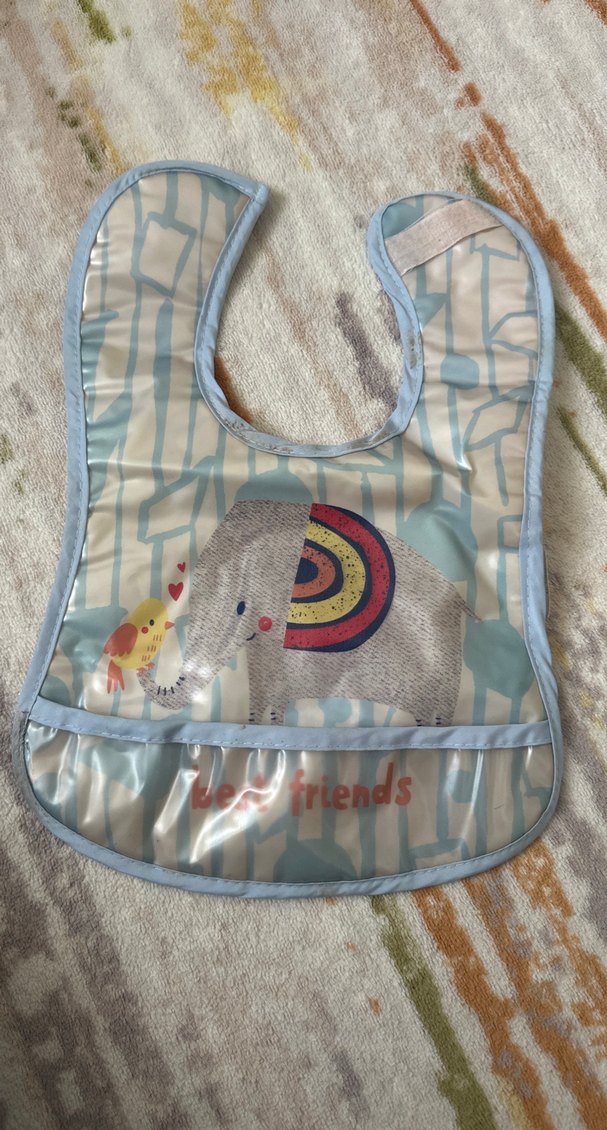 Fil ve kuş desenli, pastel renkli baskıya sahip, temizlemesi kolay malzemeden yapılmış, alt kısmında cep bulunan bebek önlüğü.