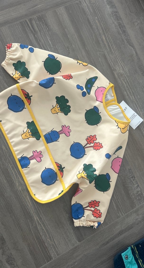 Uzun kollu, pastel renklerde sebze desenli bebek önlüğü. Lastikli manşetlere ve sarı renkte kenarlığa sahiptir, yemek sırasında kıyafetleri korur. ️
