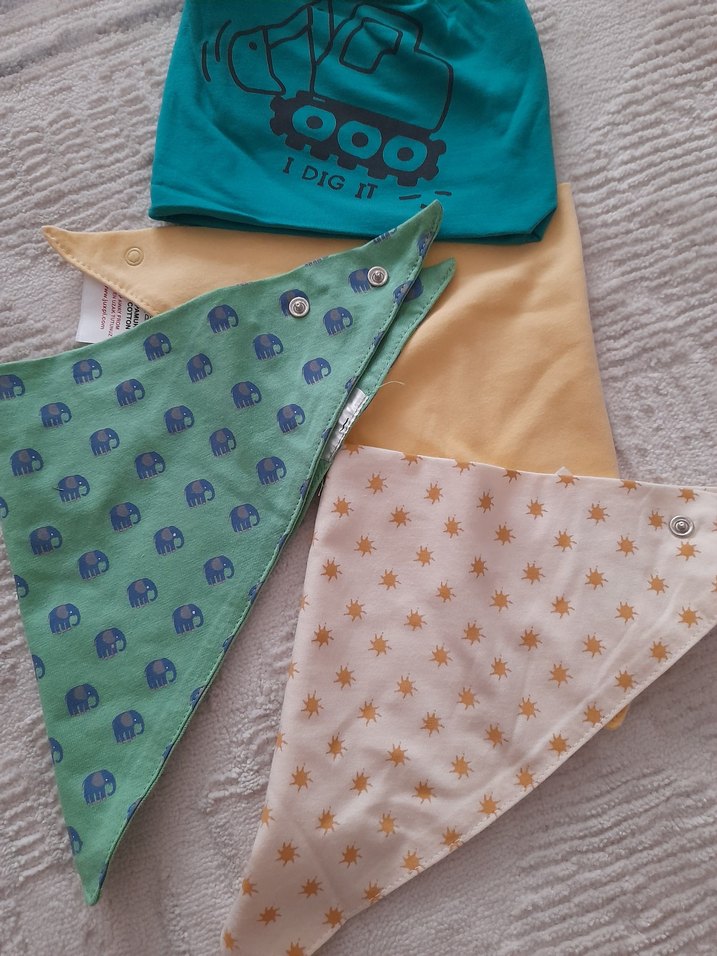 Fil ve güneş desenli, çıtçıtlı pastel renkli baskılı bebek önlükleri seti. Mavi önlük üzerinde "IDIGT" yazısı bulunur.