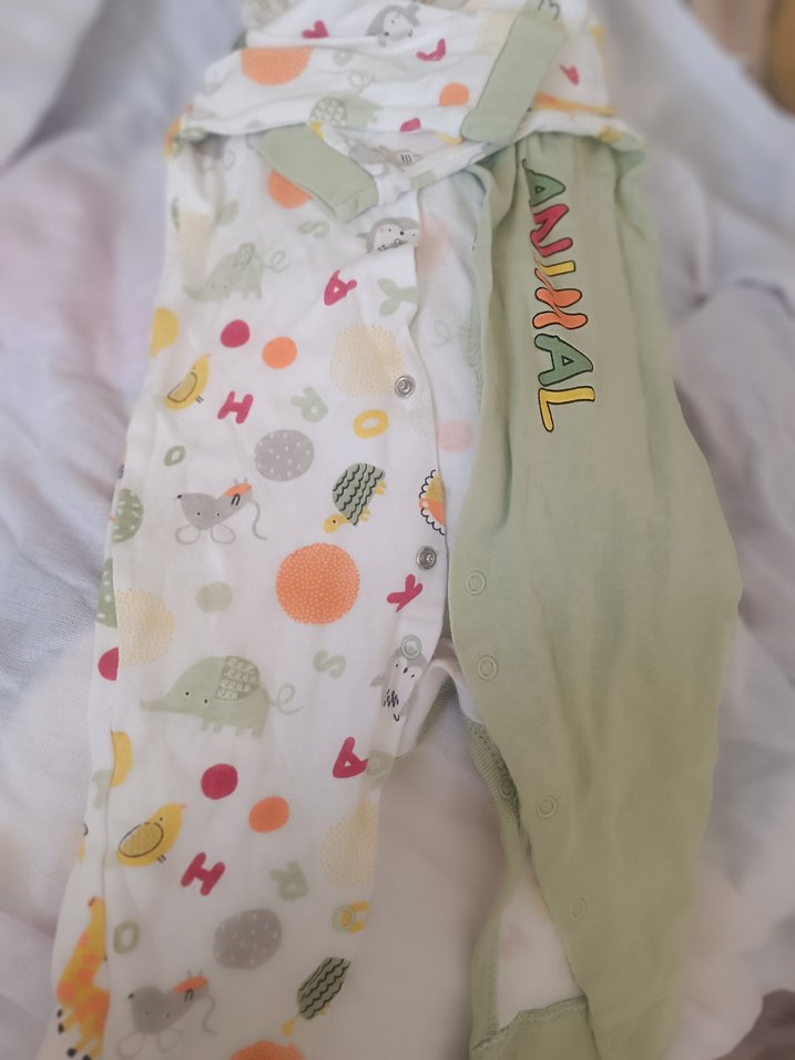 Pastel renklerde çok renkli hayvan ve harf desenleriyle bebekler için yumuşak sentetik kumaştan yapılmış uyku tulumu. Üzerinde ANIXAL yazısı ve çıtçıtları bulunur.