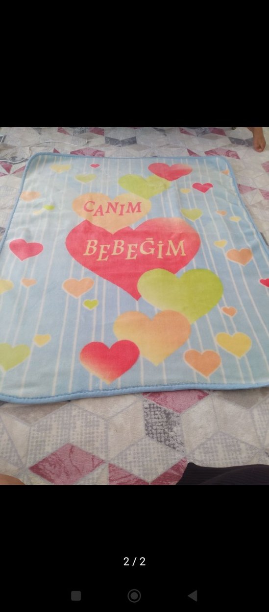 Yumuşak ve sıcak kumaştan yapılmış, pastel çok renkli kalp desenli ve "CANIM BEBEĞİM" yazılı çocuk battaniyesi.