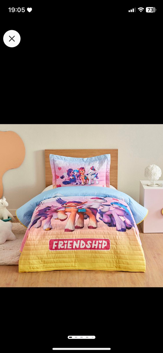 Pastel renklerde, unicorn ve "FRIENDSHIP" yazılı canlı baskılı çocuk nevresim seti. Karaca az kullanıldı
