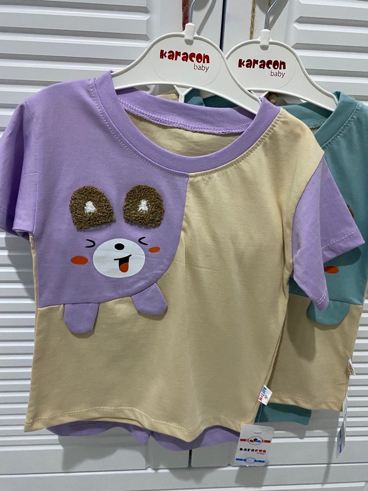 Pastel renklerde, baskılı desenli yumuşak kumaştan çocuk şortlu takım Konforlu ve rahat kullanım sağlar. 'karacen' markalıdır. Hiçbir kusuru yoktur etiketli ürün