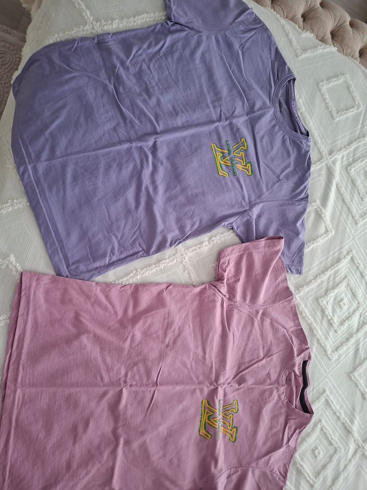 Pamuklu, crew neck, baskılı, pastel mor ve pembe renklerde, rahat kesimli kadın tişörtleri. Günlük rahat kullanım için ideal. 40 ve 44 beden için uygun hiç kullanılmadı