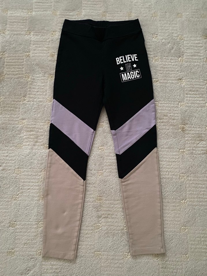 Pastel renk bloklu, baskılı "BELIEVE MAGIC" yazılı, elastik bel bantlı, yumuşak ve sıcak kumaştan kız çocuk tayt. Spor ve sokak tarzına uygun. ✨