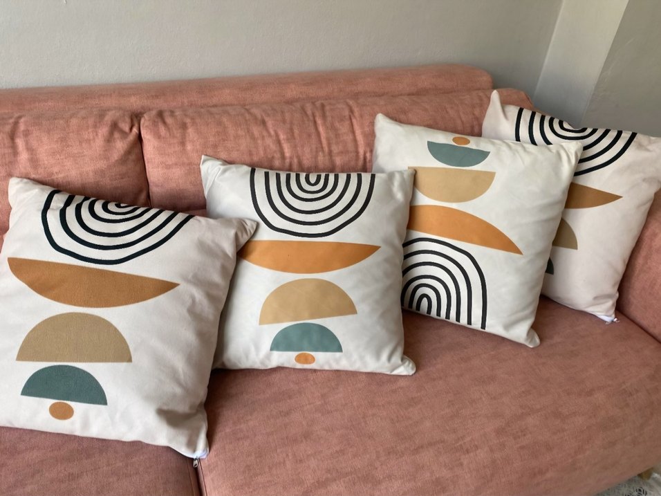 Pastel tonlarda, çok renkli baskılı geometrik desenlere sahip çağdaş yastık kılıfları, herhangi bir kanepeye şık bir dokunuş katıyor. koltuklarıma uymadı o yüzden satışta az kullanılmış iyi durumda