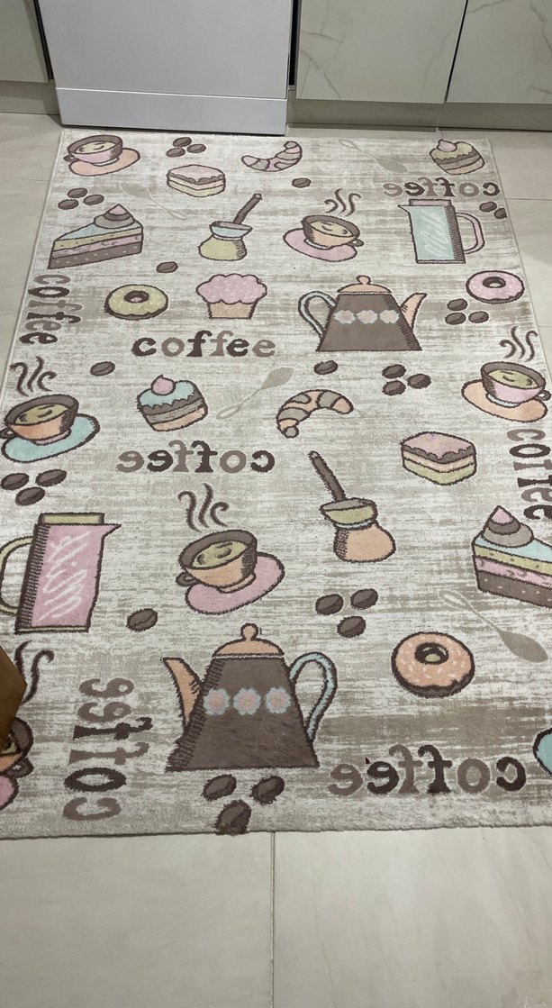 Pastel renklerde baskılı, kahve temalı desenlere sahip modern halı. Yumuşak ve eğlenceli bir dokunuş katar. ☕