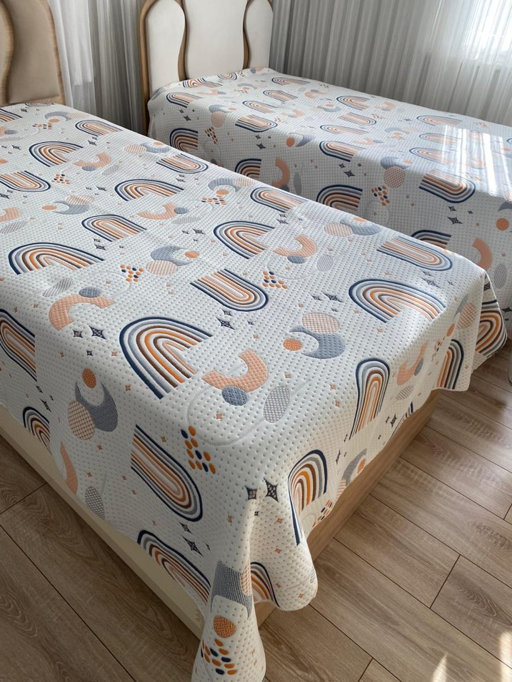 Pastel tonlarda çeşitli şekillerle baskılı desen içeren, odaya yumuşak ve sanatsal bir hava katan yorgan