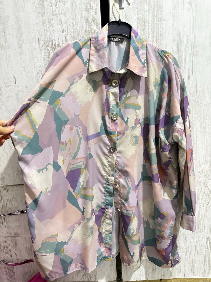 Kadın gömlek, kolye yaka ve düğmeli ön tasarıma sahip bol kesimdir. İpek gibi kumaştan yapılmış, pastel çok renkli batik desenlidir. Sokak stili ve günlük kullanım için uygundur. Uzun kollu ve normal boyda, bohem tarzını yansıtır. Standart beden