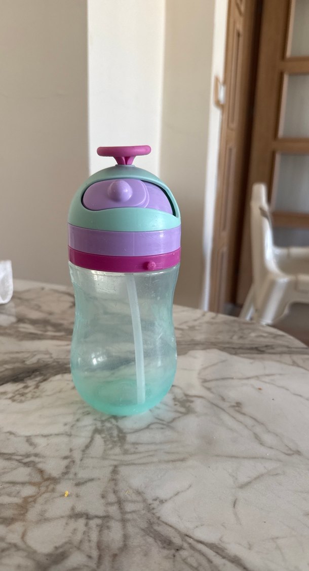 Pastel pembe ve mor kapaklı, yumuşak silikon pipetli bebek biberonu. Gövdesi hafif pastel tonlu şeffaftır.