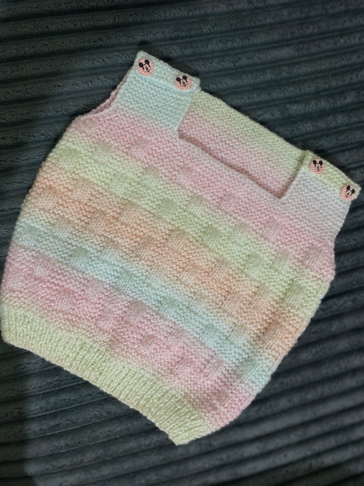 Pastel renklerde, yumuşak örgü dokulu, çok renkli ince çizgili ve omuzlarında düğme detaylı bebek önlüğü. İade yoktur. El emeği.