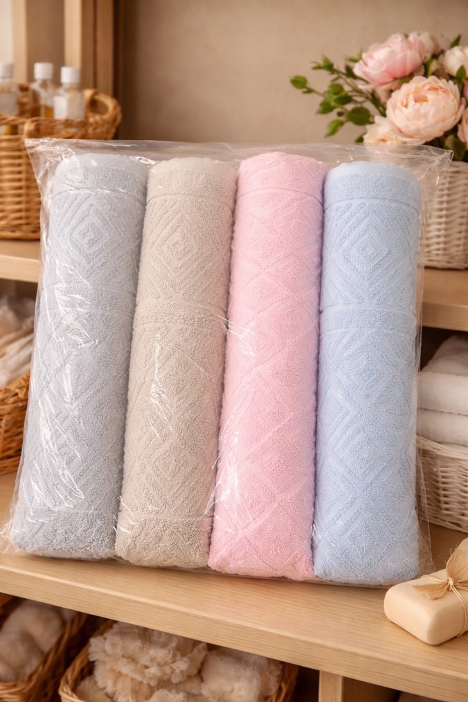 Bej, pembe, mavi ve gri pastel renklerde, hafif dokulu, konvansiyonel tarzda havlu seti. Yumuşak dokusu ile günlük kullanıma uygundur.