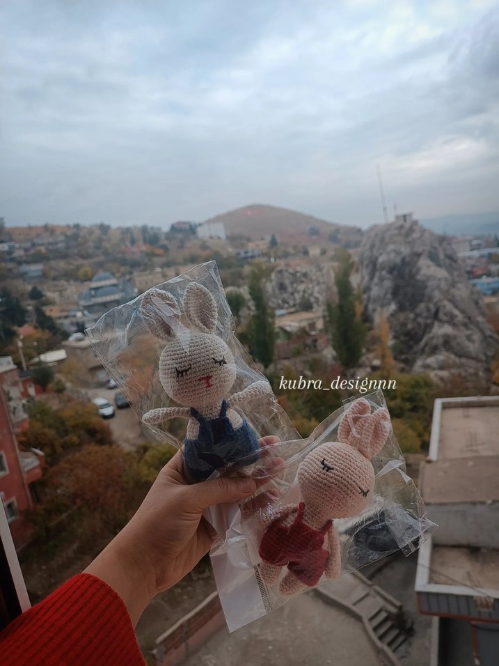 Pastel renklerde, bej tonlarında yumuşak peluş tavşan oyuncaklar. Küçük kıyafetler içinde, kapalı gözleri ve sakin ifadeleri var.