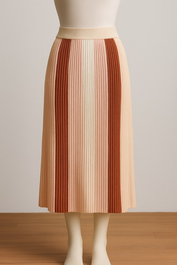 Bej renkli uzun triko etek. Pastel renklerde pilili çizgilerle bohem tarz sunar.