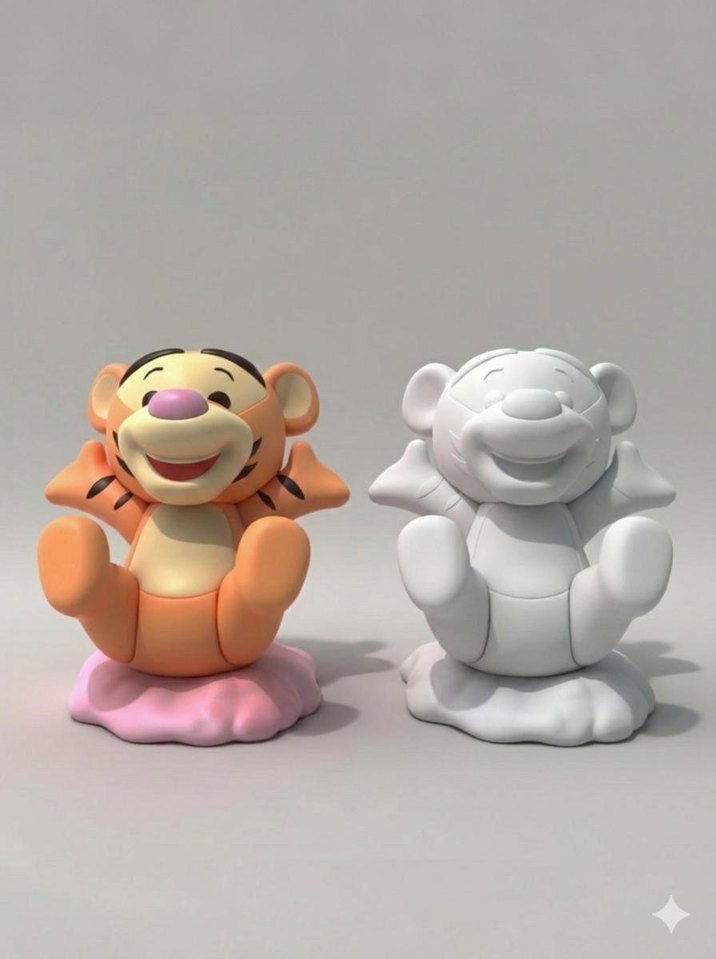 Pastel renklerde, beyaz ve turuncu tonlarında iki neşeli animasyon figürü. Mat yüzeyli ve oyuncu tasarıma sahip.