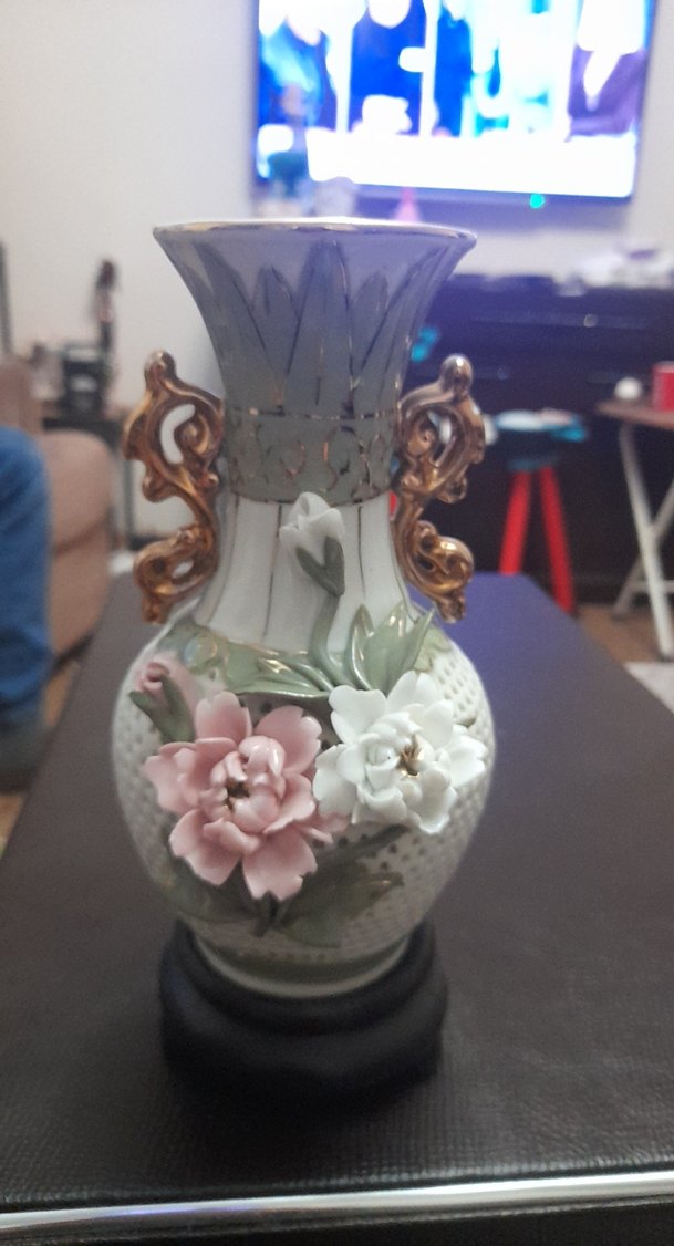 Bu beyaz vazo, pastel renkli çiçek süslemeleri ve detaylı kulplara sahiptir. Klasik şekli ve dokulu yüzeyiyle dekoratif bir dokunuş sağlar.