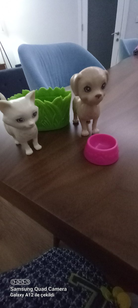 Pastel renklerde beyaz kedi ve köpek figürleri, yeşil yaprak aksesuarı ve pembe mama kabı ile birlikte.