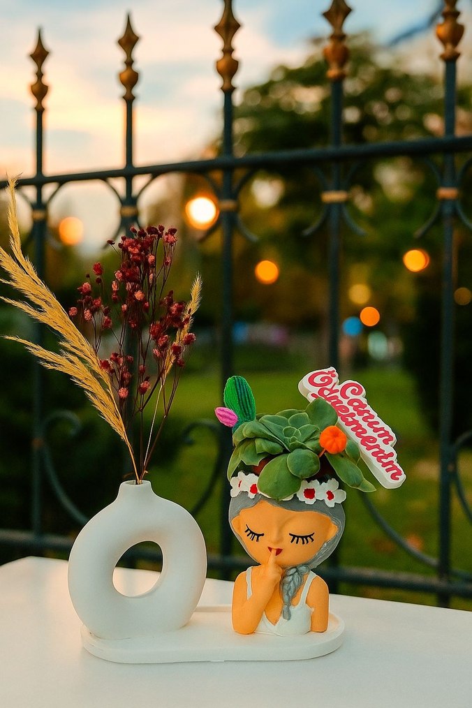 Pastel renklerde beyaz figürlü, kurutulmuş çiçekli küçük bir vazo ve sukulent temalı başlığı olan uyuyan kız figürü içerir.