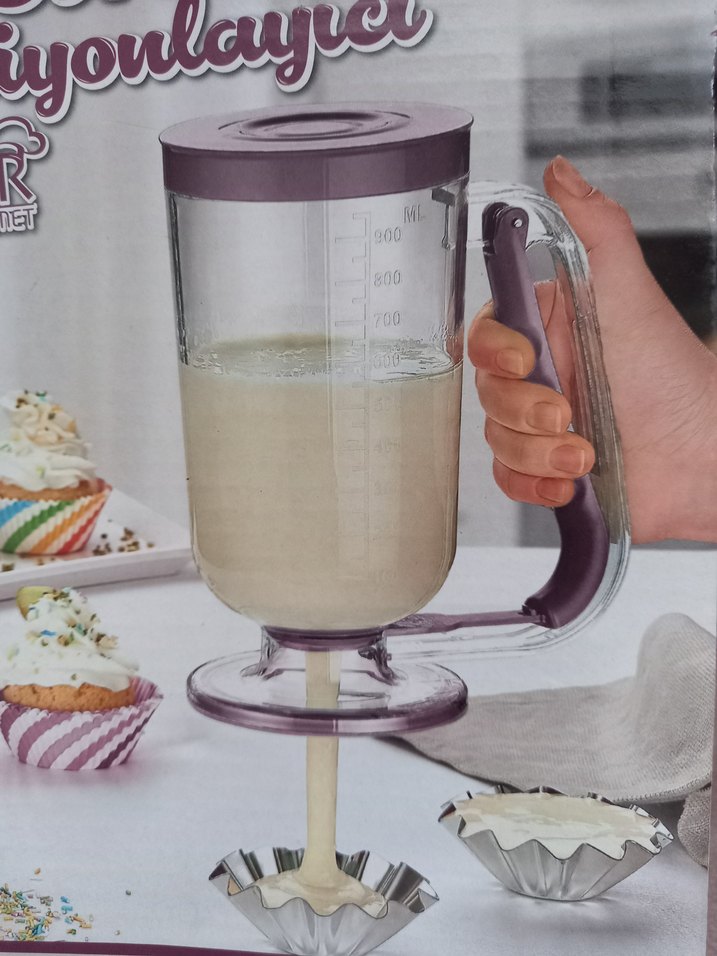 Pastel beyaz renkte, ölçü işaretli ve tutma saplı hamur dispenseri ile hamurunuzu kolayca ve düzgün şekilde dökebilirsiniz.