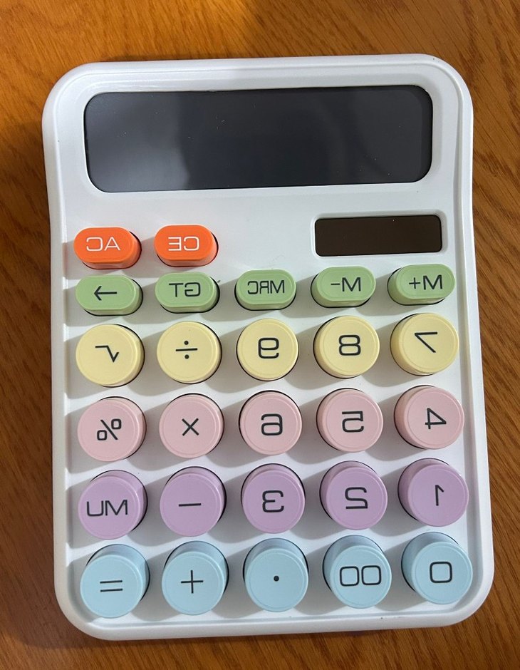 Beyaz hesap makinesi, pastel renkli tuşlara ve büyük ekranlı ekrana sahiptir. Temel hesaplama ve hafıza fonksiyonlarını içerir.
