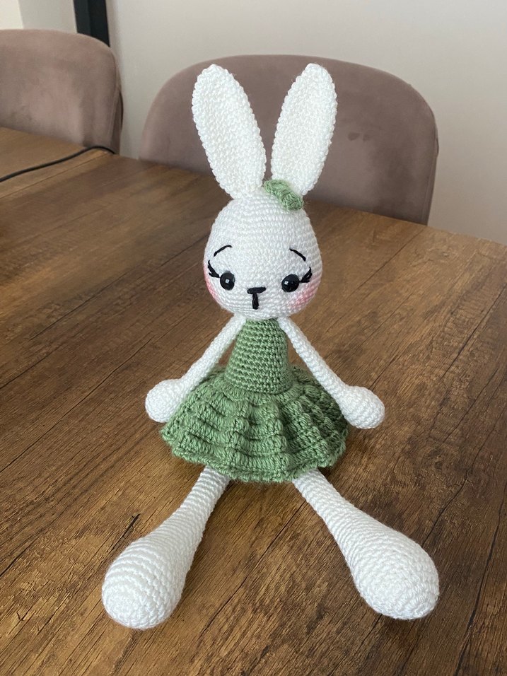 Beyaz örgü tavşan bebek, pastel yeşil elbise ve küçük yeşil fiyonk ile. İşlemeli gözler ve uzun bacaklara sahip.