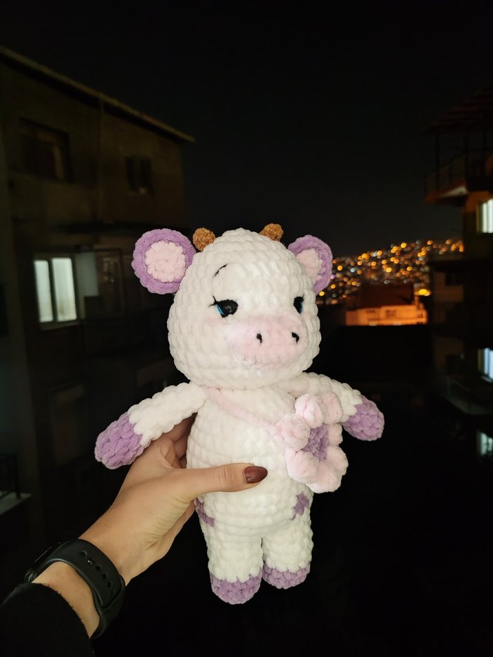 Pastel renkli detaylara sahip beyaz peluş inek oyuncak, yumuşak dokusu ve çiçekli küçük çantasıyla dikkat çeker. Adet fiyatı dır