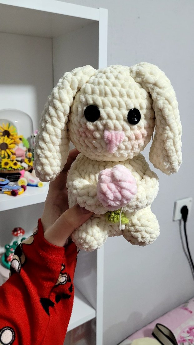 Kalın dokulu, yumuşak ve pastel renkli beyaz peluş tavşan, pembe lale tutuyor. El emeği özel tasarımdır. Kendim ördüm :)
