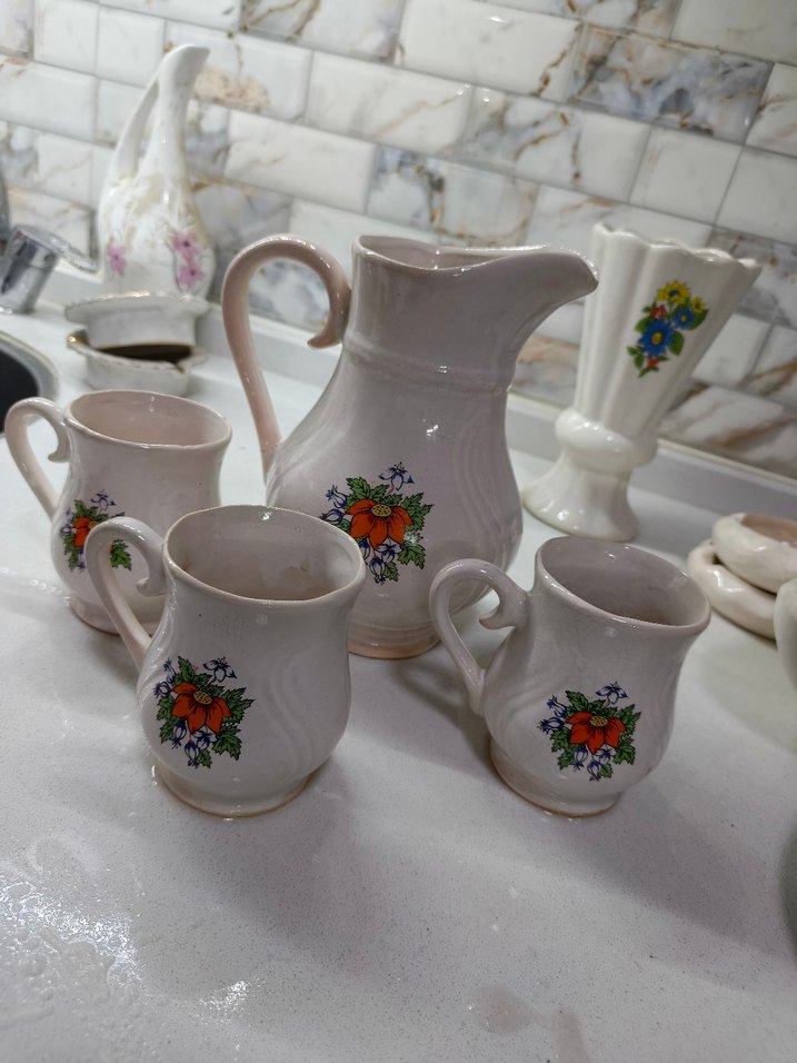 Pastel renkli çiçek desenli beyaz porselen sürahi ve bardak seti. Büyük sürahi ve uyumlu bardaklardan oluşur. Vintage bir dokunuş sağlar. ☕ fotoğraf ya belirttiğim yerde ufak bir çatlağı mevcut