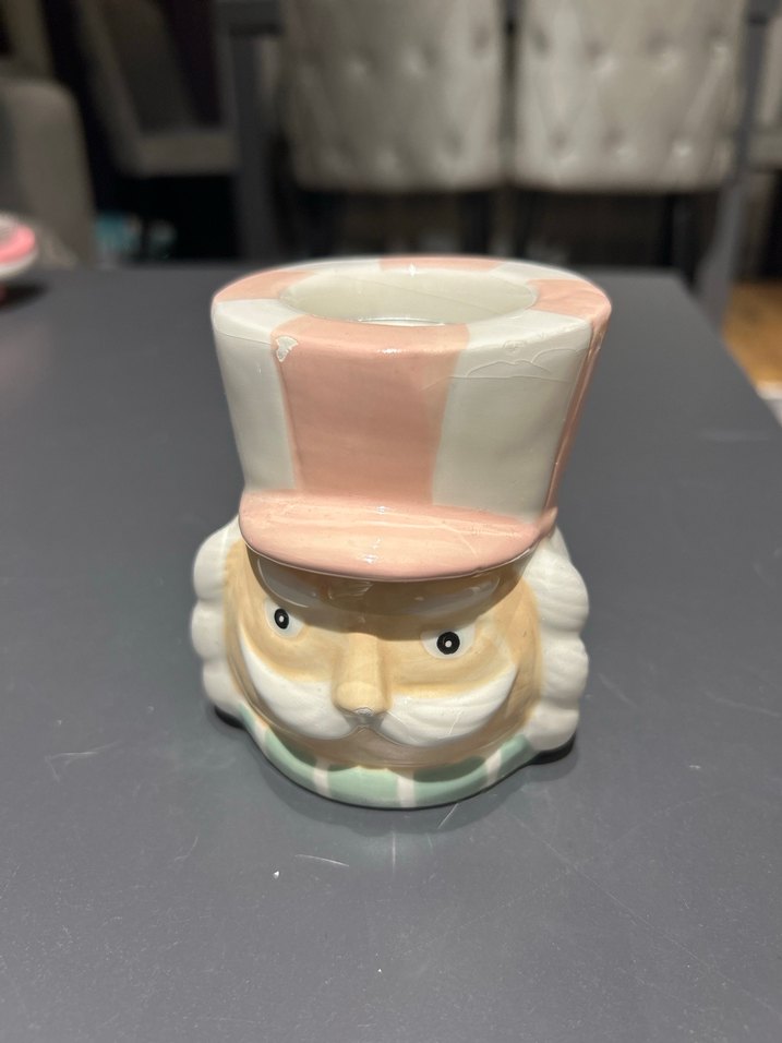 Pastel renklerde tasarlanmış beyaz seramik mumluk, şapkalı yüz figürüyle dekoratif bir görünüm sunar ️.