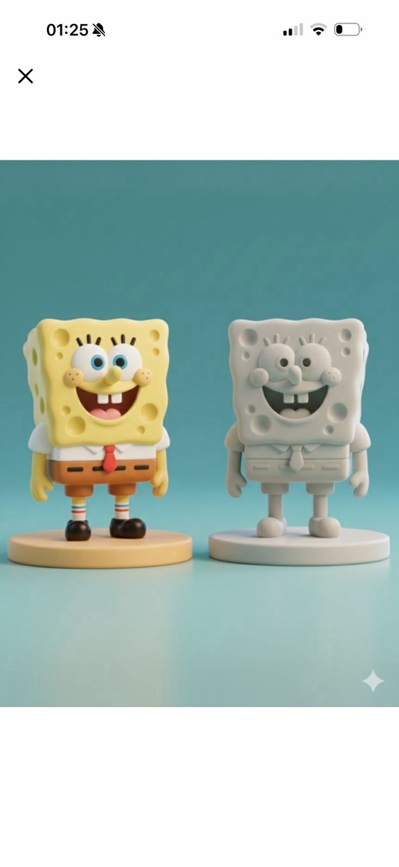 İki adet Sünger Bob figürü, biri pastel sarı diğeri beyaz renkte, yuvarlak taban üzerinde duruyor. Detaylı yüz ifadeleri ve kıyafetleri var.