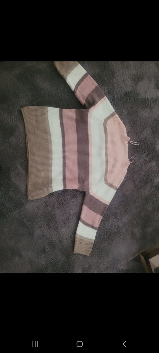 Yumuşak örgü kumaştan, bol kesim ve uzun kollu, pastel renkli yatay çizgili boğazlı kadın kazak. Günlük rahat sokak stili için uygundur.