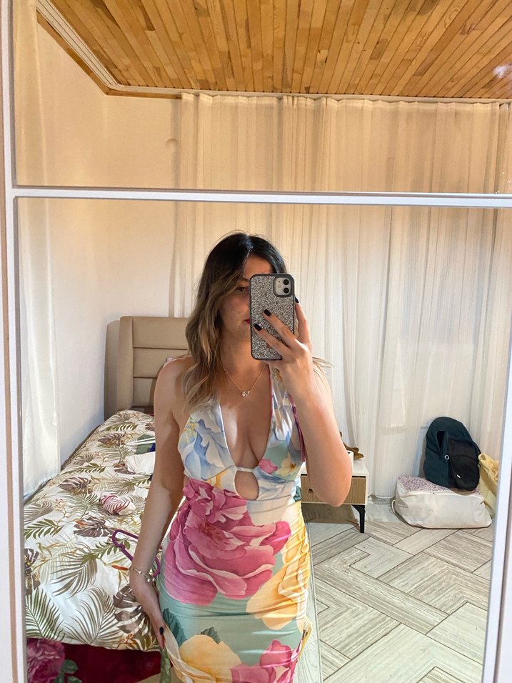 Pastel tonlarda tie-dye desenli, V yaka ve ince askılı, şeffaf detaylı, ipeksi kumaştan bohem kesim midi elbise. Romantik gece için uygundur.