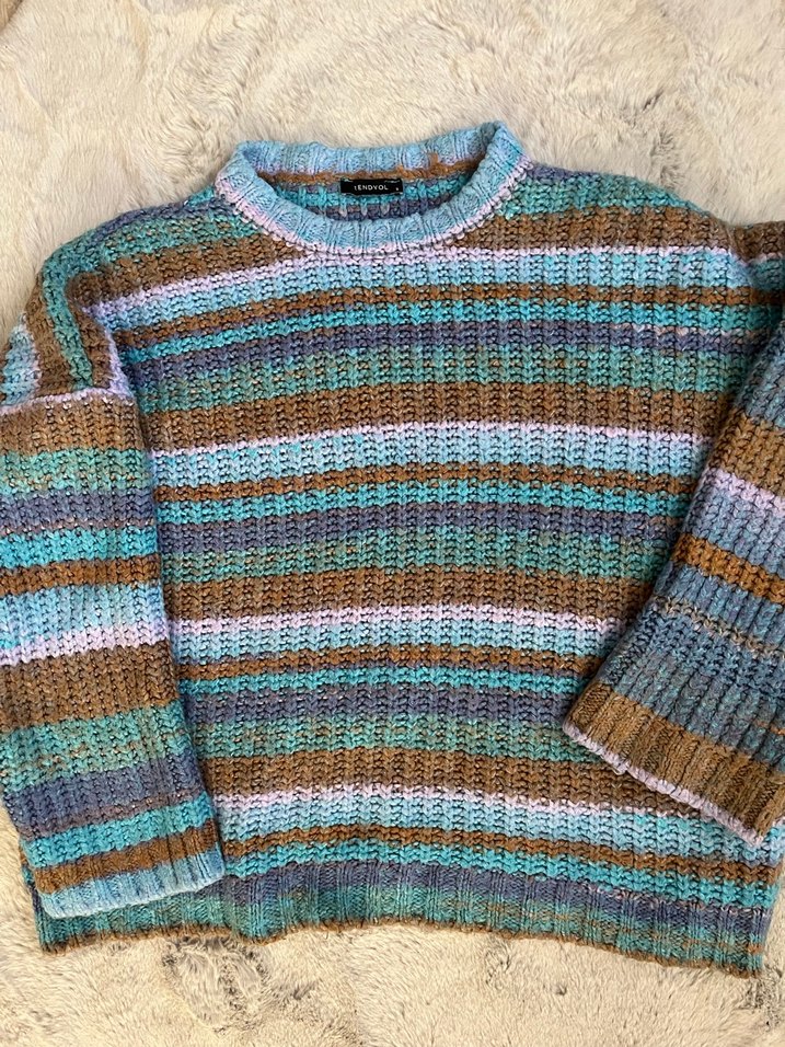 Bu kadın kazak, uzun kollu ve yuvarlak yakalı bol kesimdir. Pastel renkli çizgili örgü deseniyle rahat ve bohem tarz sunar.