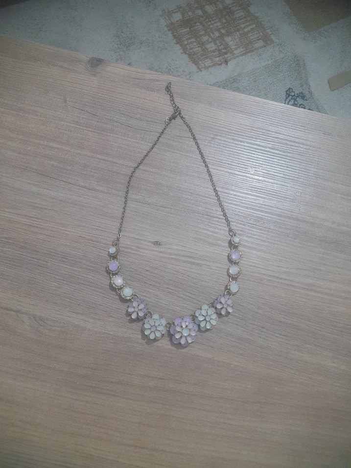 Bohem tarzda, pastel renkli boncuklu çiçek desenli, normal uzunlukta midi kolye, günlük kullanıma uygun.
