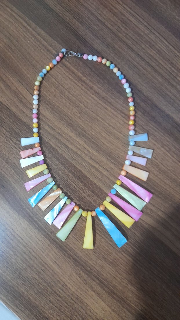 Pastel renkli boncuklar ve tie-dye desenli uzun bohem kolye, parti kıyafetlerine renk katar.